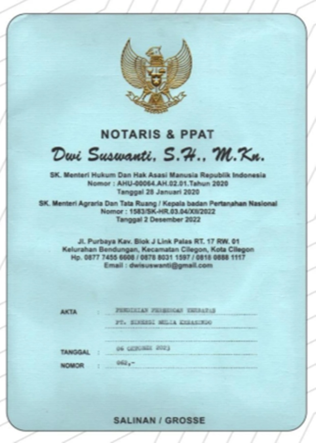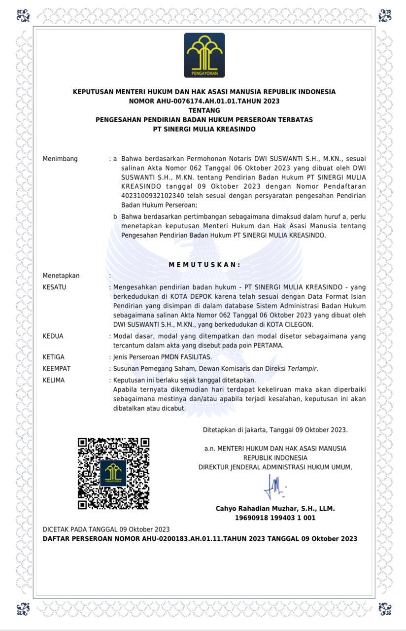 Di PT. Sinergi Mulia Kreasindo, kami beroperasi di atas fondasi hukum yang kokoh. Seluruh legalitas perusahaan kami telah terdaftar dan sesuai dengan peraturan yang berlaku di Indonesia.